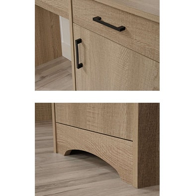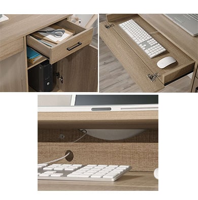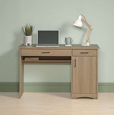 Our Essential Computer Desk comes in a Summer Oak finish.  Supplied with a large drawer/shelf features flip-down panel for keyboard or mouse and a small drawer with metal runners and safety stops.