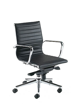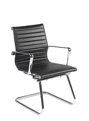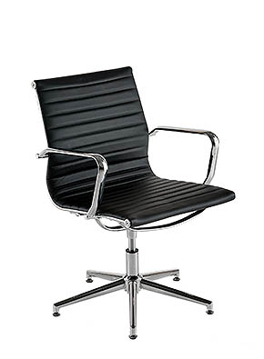 It is supplied with a ribbed seat and back design in black leather and comes with chrome arms and base as standard.