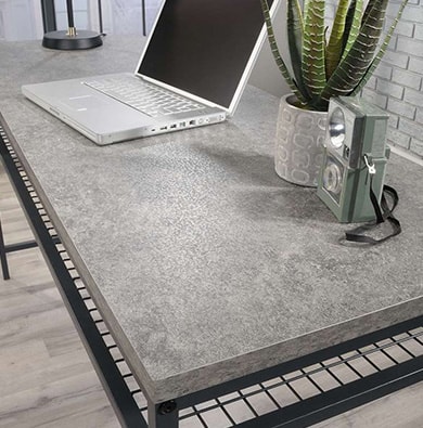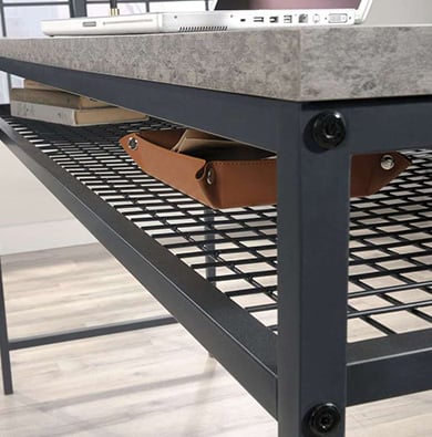 Our contemporary home office L-shaped Metal Desk is in Rich Walnut finish with Slate Grey accents.  The large desk top with L shape return provides a generous working area