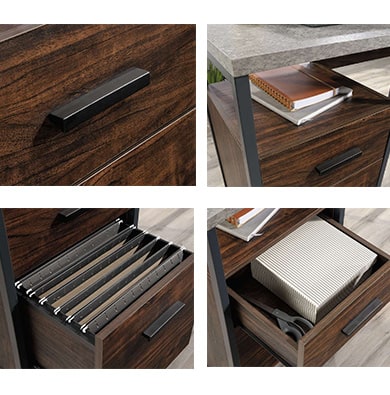 Complete with filing drawer with full extension slides for letter-size hanging files, storage drawer with metal runners and safety stops and two open shelves for additional storage.