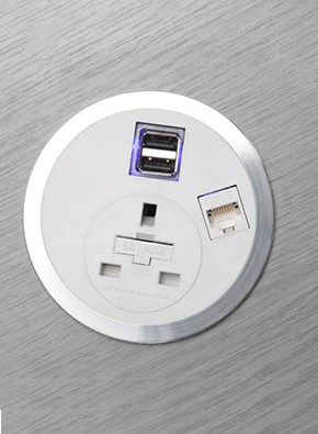 Charge your device using our Port module. In-desk Grommet power module designed to fit into a standard 80mm port hole in the desk.