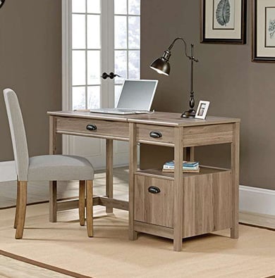 This desk has a hidden storage area beneath top, lower filing drawers with full extension slides for letter-sized hanging files, storage/stationery drawer and an open shelf for additional storage.
