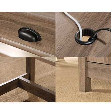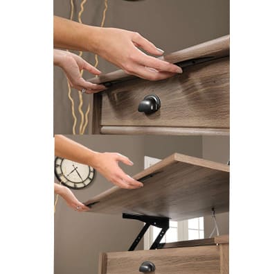 Our Ergonomic sit/stand home desk comes in a Salt Oak finish.  Left side of desktop lifts up and forward to create a versatile option to work sitting or standing
